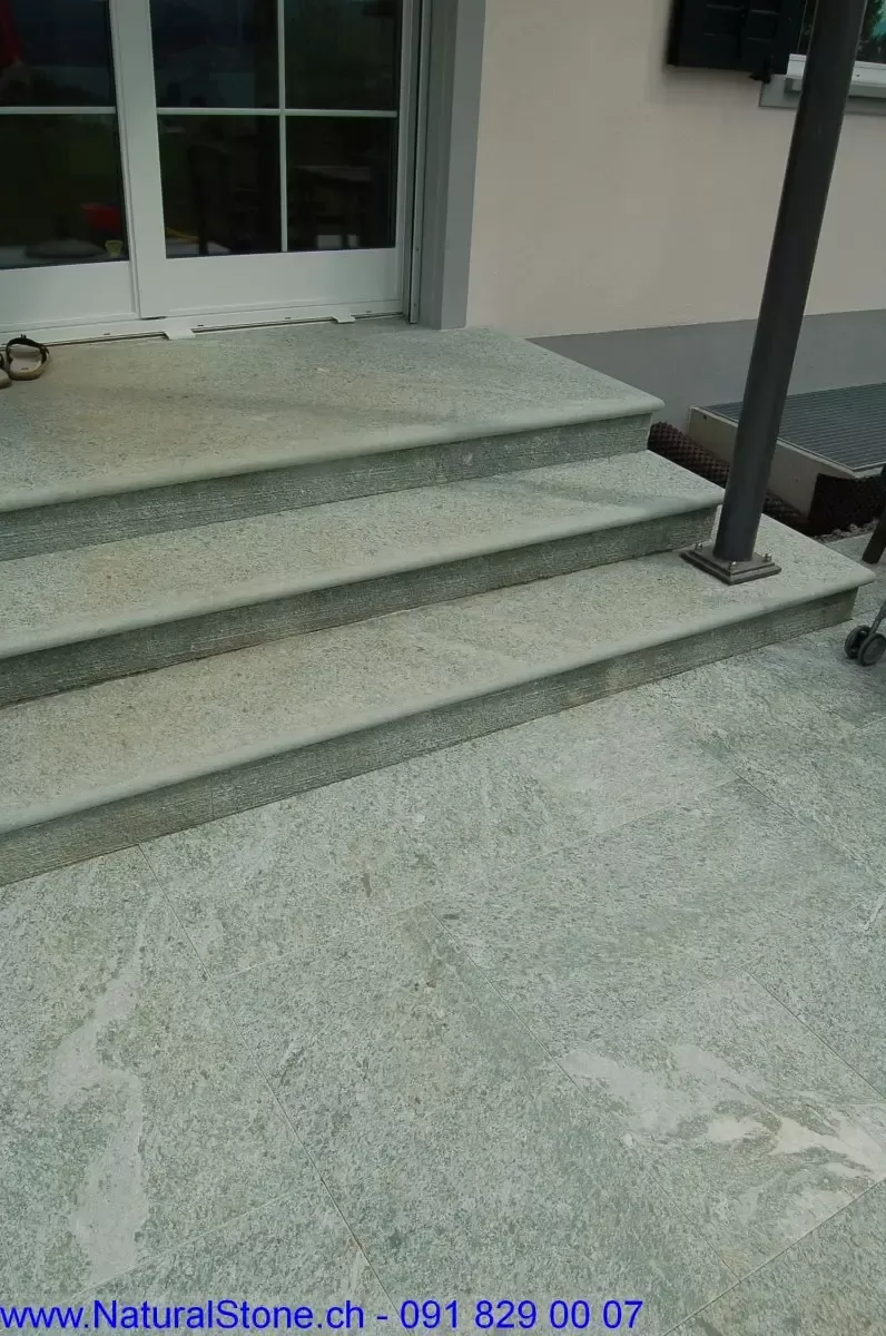 Andeer Bodenblatten in einem speziellen grünlichen Farbton. Es ist der Stein, welcher in der Schweiz im Bündnerland in der Region Andeer abgebaut wird.