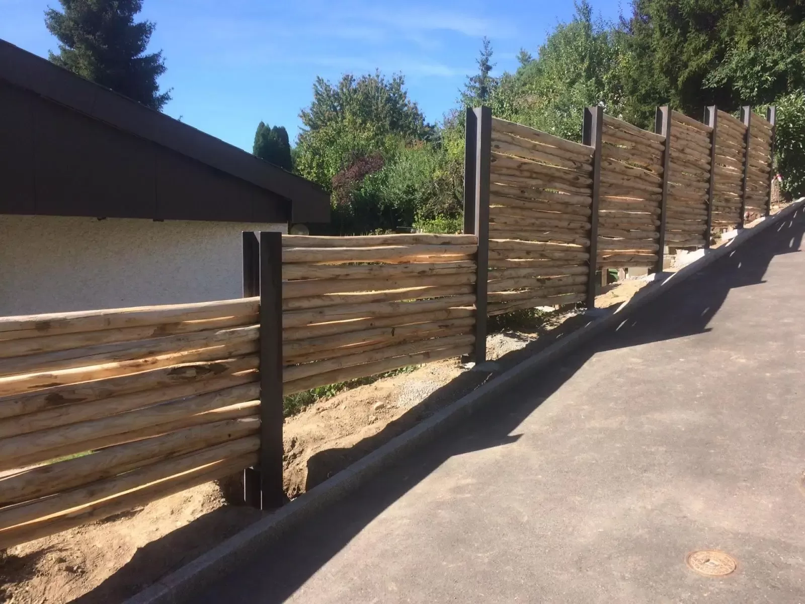 Stützen und horizontaler Handlauf aus fein geschliffenem Kastanienrundholz. - Sichtschutzwand