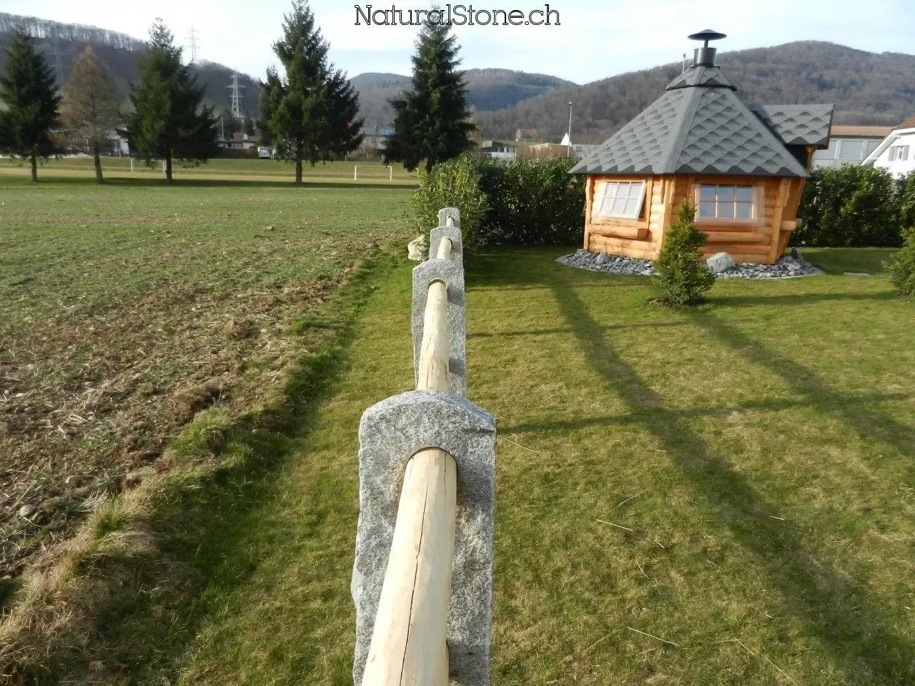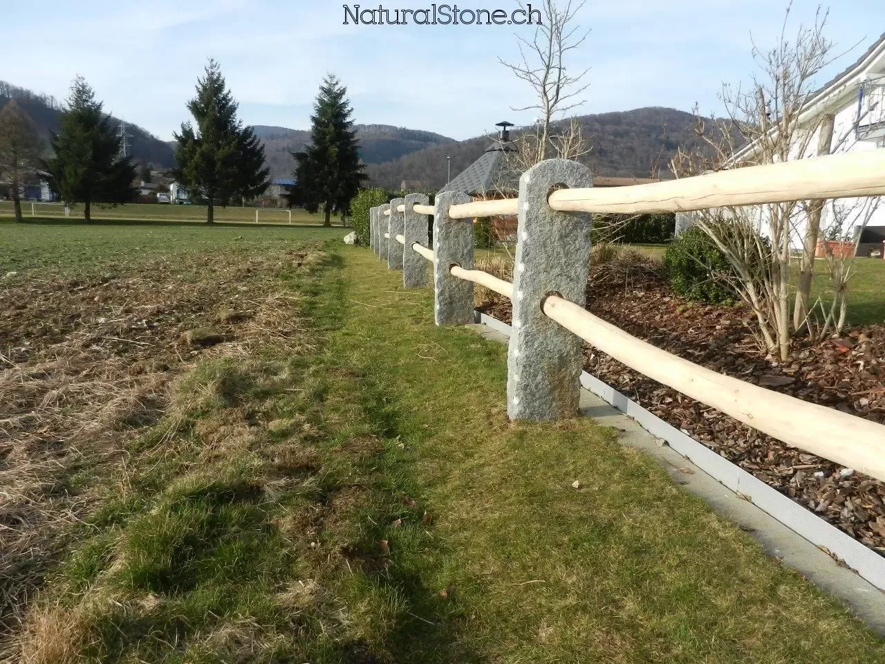 Steinpfosten mit Bohrung durch welche das Zaunholz durch gestossen wird. - Treppen Handlauf